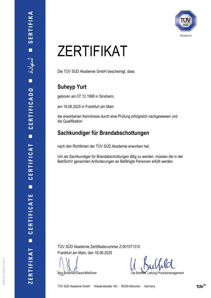 Ein zuverlässiger Brandschutz ist essenziell für die Sicherheit von Menschen und Anlagen. Unsere Lösungen verlangsamen die Ausbreitung von Feuer und Rauch, schützen tragende Strukturen und erfüllen alle relevanten Sicherheitsvorschriften. Mit hochwertigen, feuerbeständigen Materialien tragen wir dazu bei, Risiken zu minimieren und Sachwerte bestmöglich zu sichern. Die fachgerechte Ausführung wird dabei durch unseren TÜV-zertifizierten Sachkundigen für Brandabschottungen – unseren Geschäftsführer – gewährleistet.